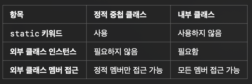 ๋ด๋ถ ํด๋์ค๋ ๋ค์ ์ธ๋ถ์ ์ผ๋ก ๋๋๋ค.