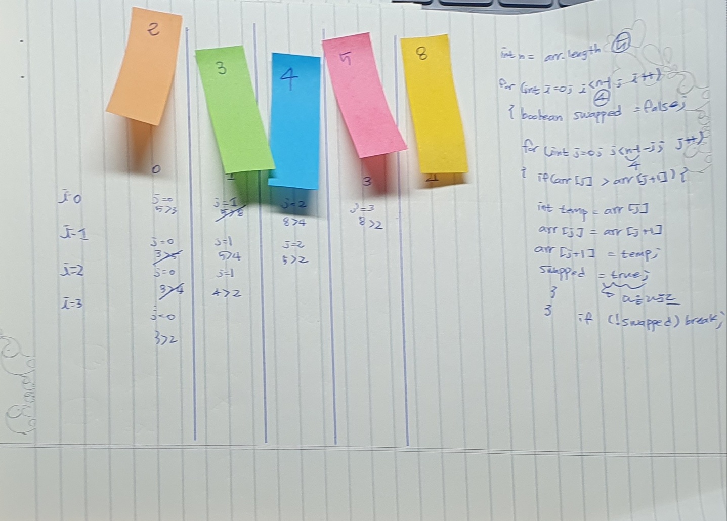 - ์ฒ์์๋ ๋ค์ฏ ๊ฐ๋ฅผ ์ ๋ถ ๋น๊ตํ์ง๋ง, ํ ๋ผ์ด๋๊ฐ ๋๋ ๋๋ง๋ค ์ ๋ ฌ์ด ์๋ฃ๋ ์ซ์๋ ๊ฑด๋๋ฆฌ์ง ์์๋ ๋๋ค. ๊ทธ๋์ ์ ์ ๋น๊ตํ ์ซ์๊ฐ ์ค์ด๋ ๋ค. ๊ทธ๋์ j์ ๊ดํ for๋ฌธ์ for(int j = 0; j < n-1-i ; j++)๋ก ์ค์ ํ ๊ฒ์ด๋ค.