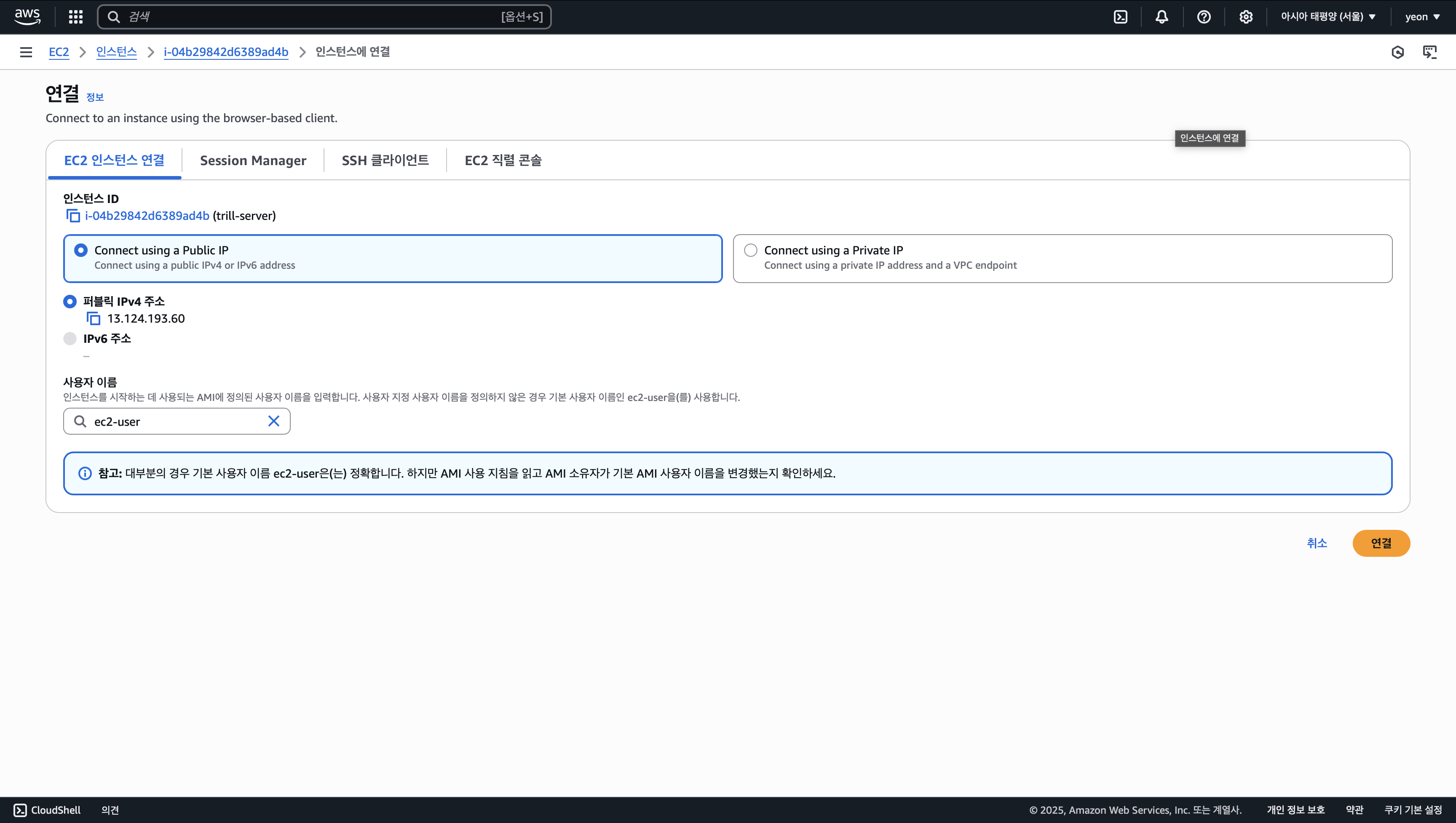 - โถ SSH ํด๋ผ์ด์ธํธ ๋๋ EC2 Instance Connect