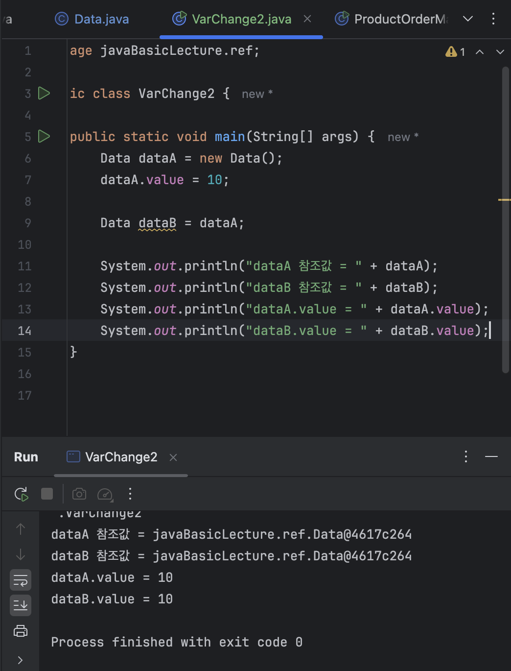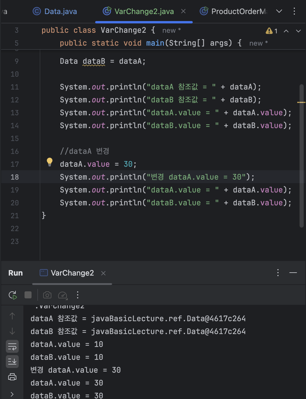 • ํ์ชฝ์์ ์ฐธ์กฐํ๋ ๊ฐ์ฒด์ ๊ฐ์ ๋ณ๊ฒฝํ๋ฉด, ๋ค๋ฅธ ์ชฝ์์๋ ๋ณ๊ฒฝ๋ ๊ฒฐ๊ณผ๋ฅผ ํ์ธํ ์ ์๋ค.