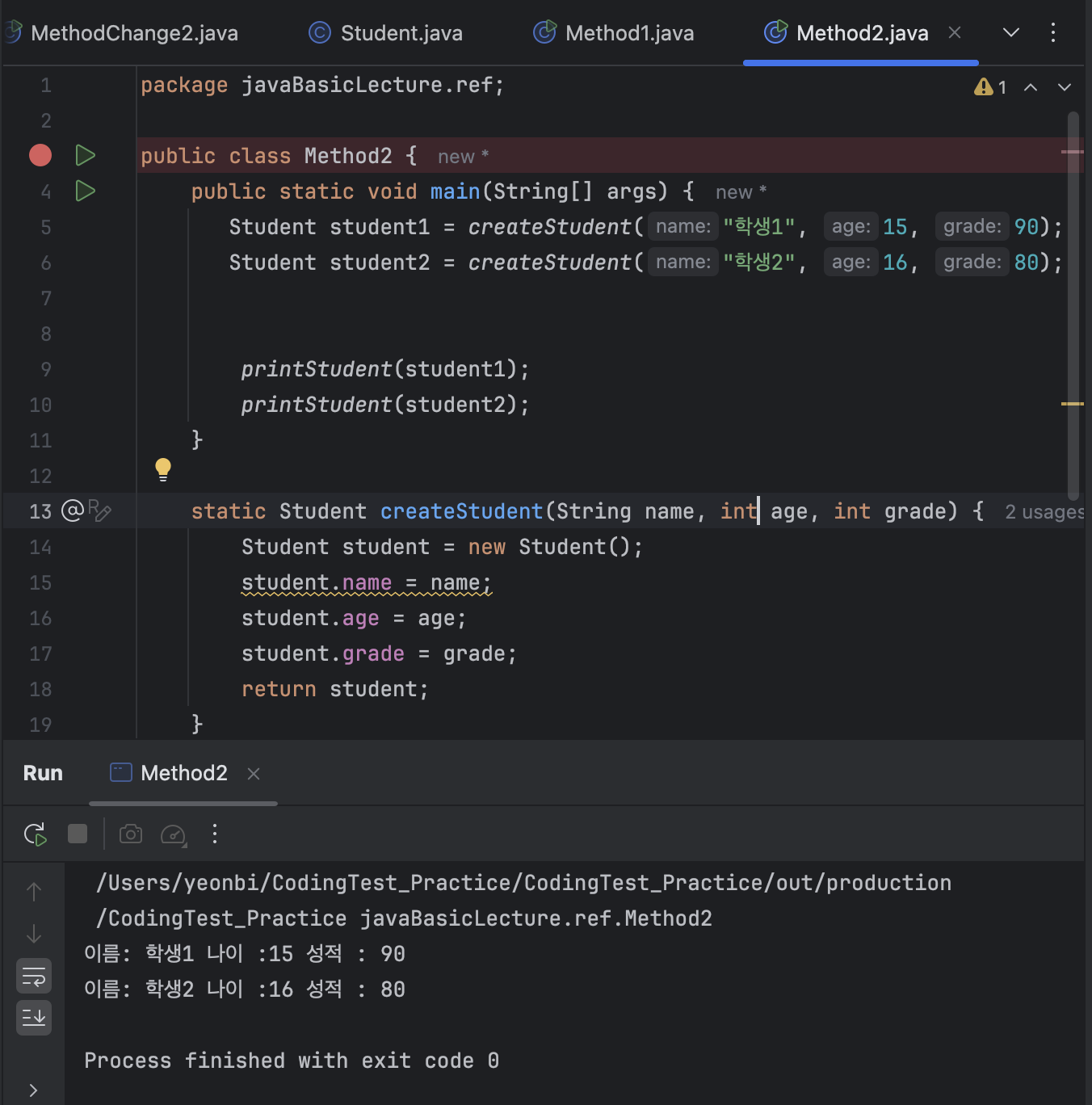 ๋ฉ์๋ ๋งค๊ฐ๋ณ์๋ก ์ ๋ฌ๋ ๊ฐ์ ์ฌ์ฉํด Student ๊ฐ์ฒด์ name, age, grade ํ๋๊ฐ ์ด๊ธฐํ๋๋ค.