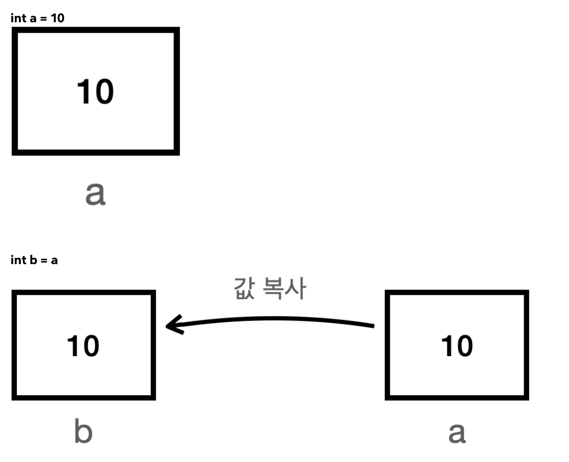 ์ ๊ทธ๋ฆผ์์ int b = a๋ ๊ฐ 10์ ๋ณต์ฌํ์ฌ b์ ์ ๋ฌํ๋ค.