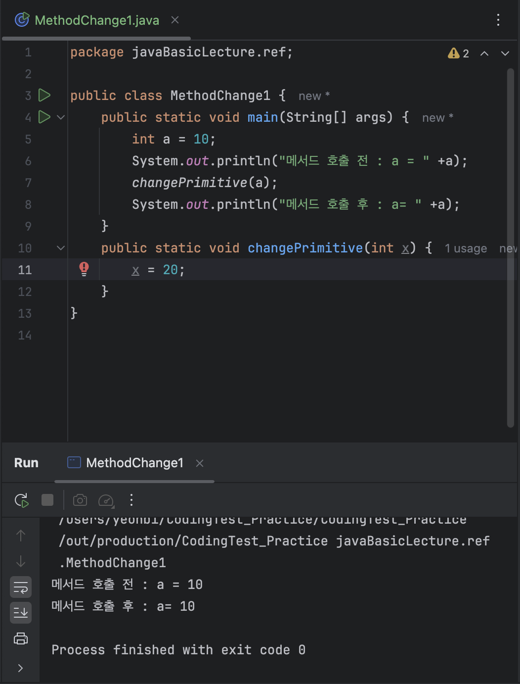 • ๋ณ์ a์ ๊ฐ 10์ด ๋ณต์ฌ๋์ด ๋ฉ์๋ ๋งค๊ฐ๋ณ์ x๋ก ์ ๋ฌ๋๋ค.