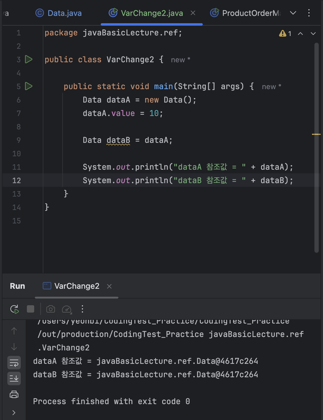• ๋ฐ๋ผ์, ๋ ๋ณ์๊ฐ ๋์ผํ ์ฐธ์กฐ๊ฐ์ ๊ฐ์ง๊ฒ ๋๊ณ , ๊ฐ์ ๊ฐ์ฒด๋ฅผ ๊ฐ๋ฆฌํจ๋ค.