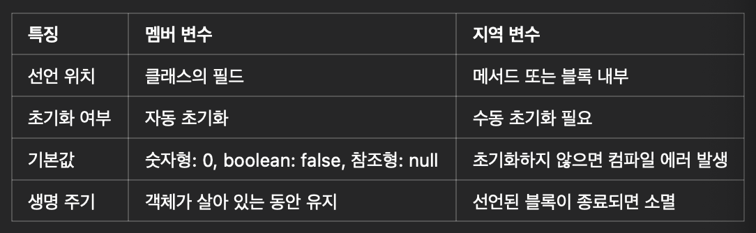 - ์ง์ญ ๋ณ์: ๋ฉ์๋์ ์ ์ธ, ๋งค๊ฐ๋ณ์๋ ์ง์ญ ๋ณ์์ ํ ์ข ๋ฅ์ด๋ค.