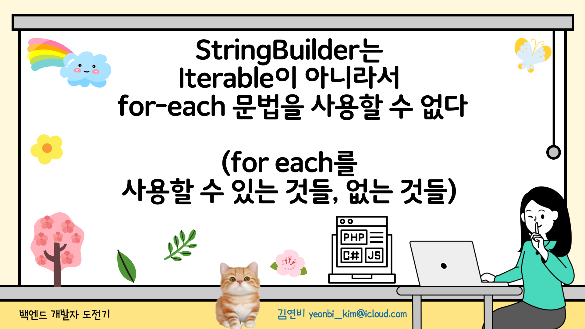 StringBuilder๋ Iterable ์ธํฐํ์ด์ค๋ฅผ ๊ตฌํํ์ง ์์๊ธฐ ๋๋ฌธ์ for-each ๋ฌธ๋ฒ์ ์ฌ์ฉํ ์ ์๋ค.